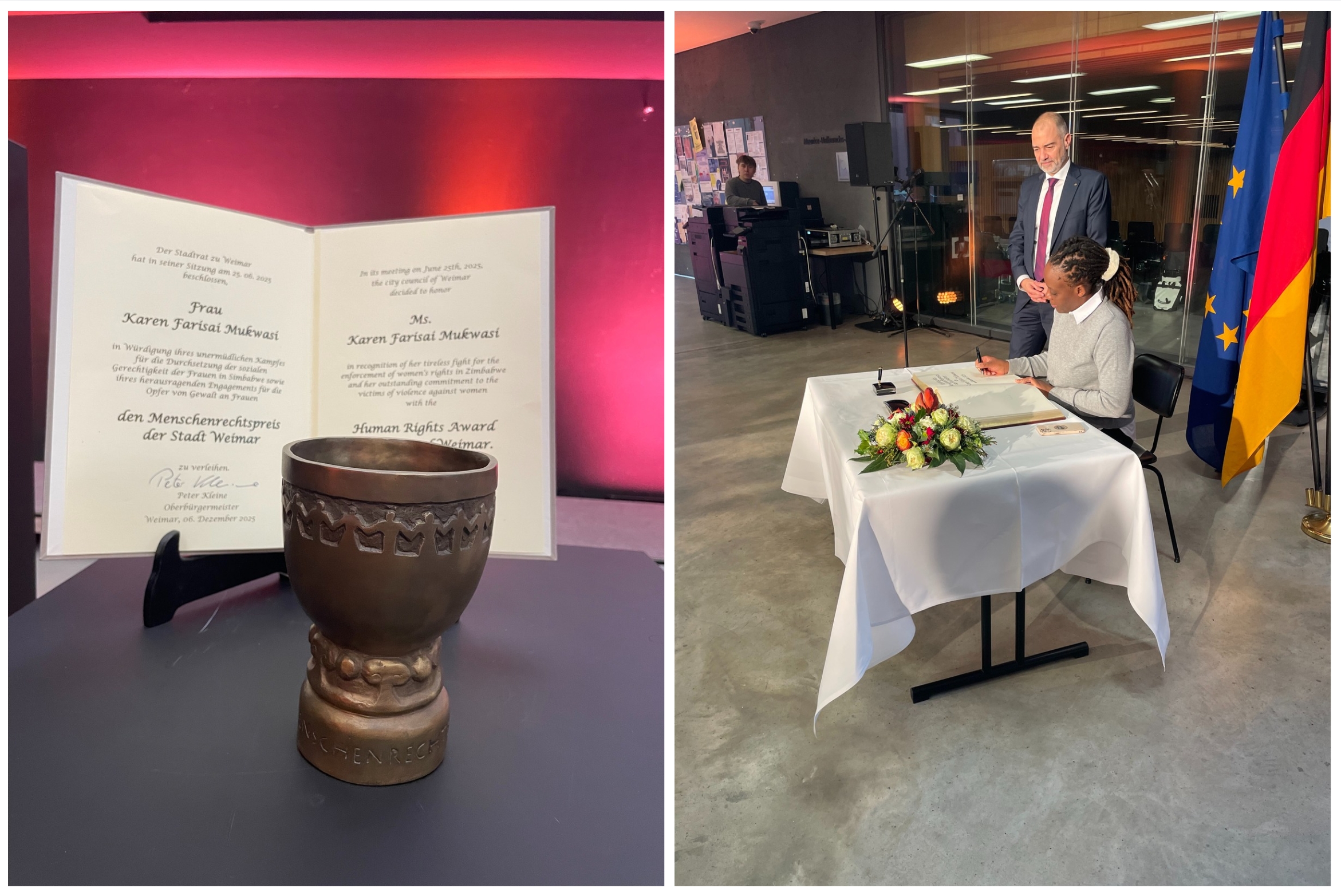 Karen Mukwasi trägt sich ins goldene Buch der Stadt Hamburg ein. Oberbürgermeister Peter Kleine heißt sie willkommen.